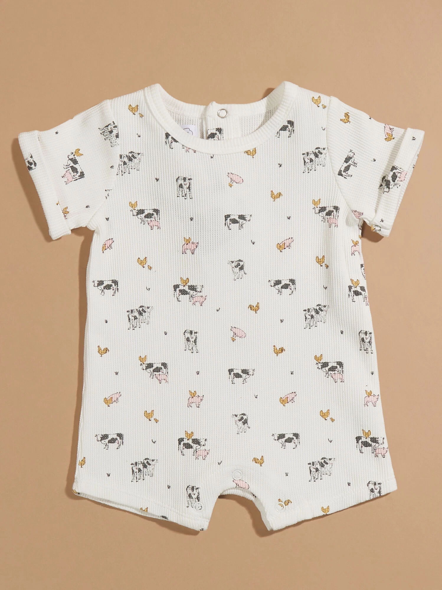 Elevate your little one’s daily activities with this easy all in one outfit. Made with a gentle waffle weave, this charming look includes rolled short sleeve cuffs and practical inner leg snaps for easy diaper changes. Whether your little is napping or exploring, this cozy jumper offers the cutest style with the farm inspired print.