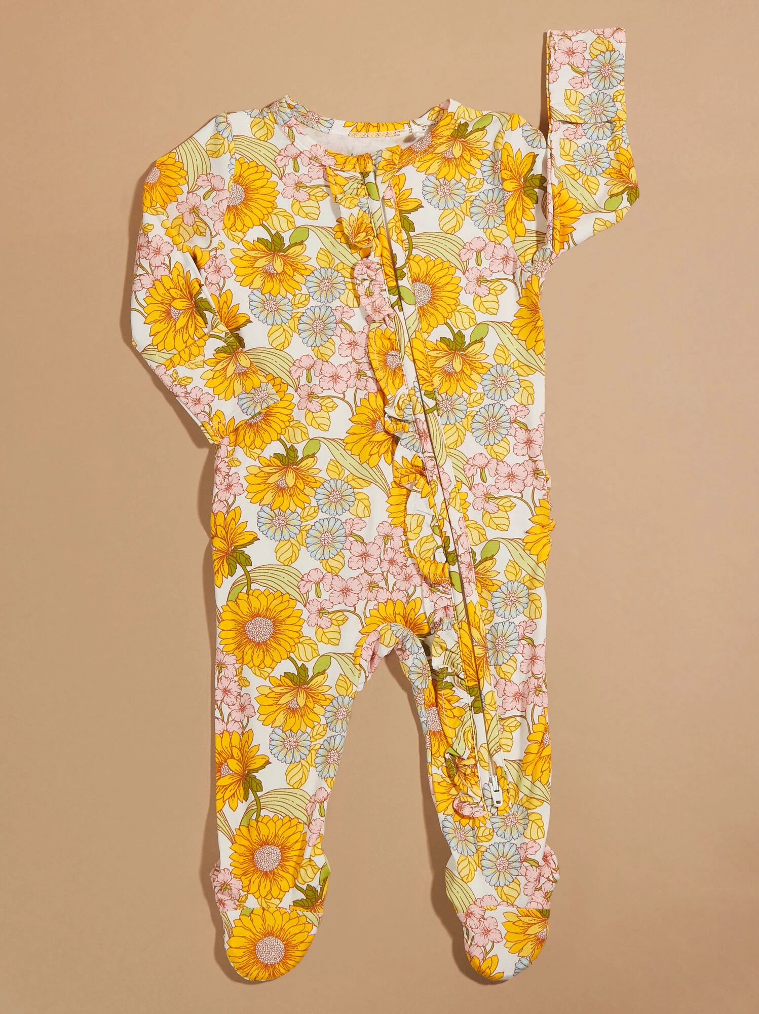 This vibrant sunflower footie brings a bright touch to your little’s look featuring dainty ruffle detailing down the zipper and on the back. The buttery soft material from eco-friendly bamboo provides breathability at bedtime, while the two-way zipper and fold over hand cuffs meet all the practical needs.