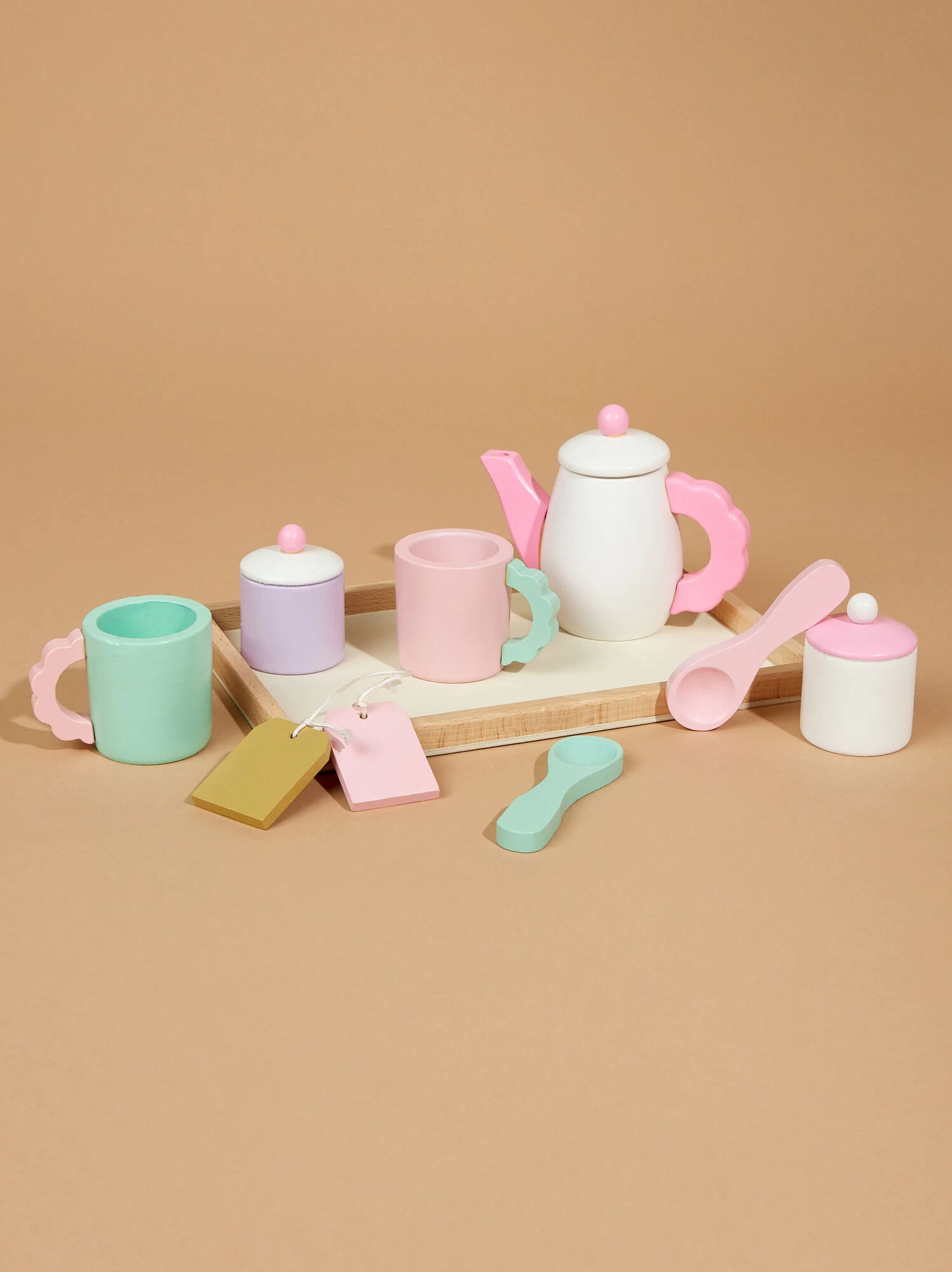 Welcome to the enchanting world of make-believe with this 10 piece wood tea party set. Made to spark imagination and bring endless joy to your little ones playtime adventures. This set includes a teapot, cups, saucers, spoons, and even pretend tea bags. This wood tea party set is guaranteed to be a favorite among all ages.